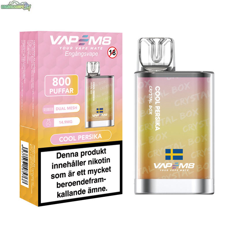 VapeM8 Crystal Box engångsvape är designad som en liten flaska och ger en modern känsla. Crystal Box ger en trio av intensiv smak, lång batteritid och ångproduktion. Det är en MTL Crystal Vape (Mun Till Lunga) som efterliknar känslan av att röka en vanlig cigarett. Du har ett brett urval av många olika smaker att välja mellan, noggrant utvalda för att leverera klara smaker.